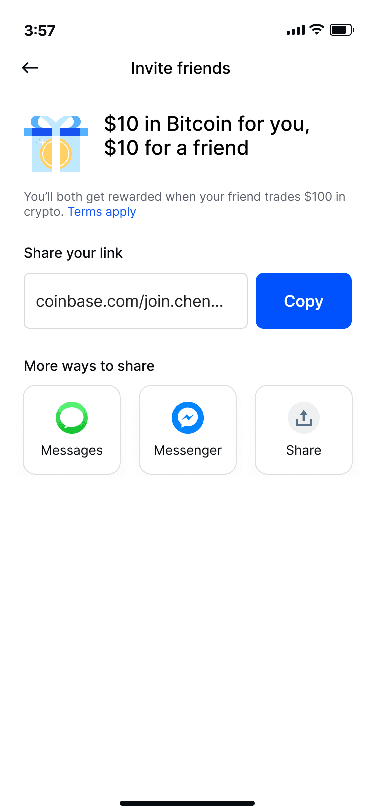 Share your code with a friend before they sign up and you’ll both get $10 in Bitcoin after they buy or sell $100 of crypto. Terms apply